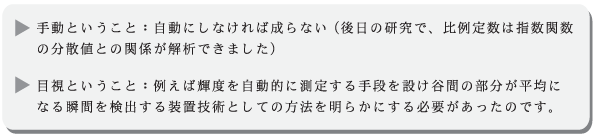 すなわち、手動によって信号を上下に移動させること、輝度の平均化が行われる瞬間を目視によって定めること。その結果、上の式でランダムノイズの実行値を割り出すことを特徴とするランダムノイズ測定方法というのが特許請求項目の骨子だったのです。